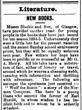 A Trove Australia search (in February 2017) for occurrences of Henty’s name in Australia’s digitised newspapers delivers thousands of ‘hits’. ‘G. A. Henty’ appears over 3,500 times between 1880 and 1919. The peak period is in the 1890s when the author’s name is mentioned on nearly 2,000 occasions. (He is listed many more times, in association with his book titles, but with only his surname printed, minus the distinguishing ‘G. A.’ initials.)