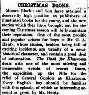 Copies of Henty books regularly found their way into the hands of Australian boys as school and Sunday School book prizes, and as Christmas presents. The Australasian’s advertisement in December 1891 (extract reproduced at right) is typical. It advertises six ‘Christmas Books’, three of them by Henty. The Henty titles are: The Dash for Khartoum (‘the expedition up the Nile, for the relief of General Gordon at Khartoum’), Held Fast for England (‘the defence of Gibraltar during the famous siege of 1779-83’) and Redskin and Cowboy (‘a tale of the wild frontier regions of the United States’).