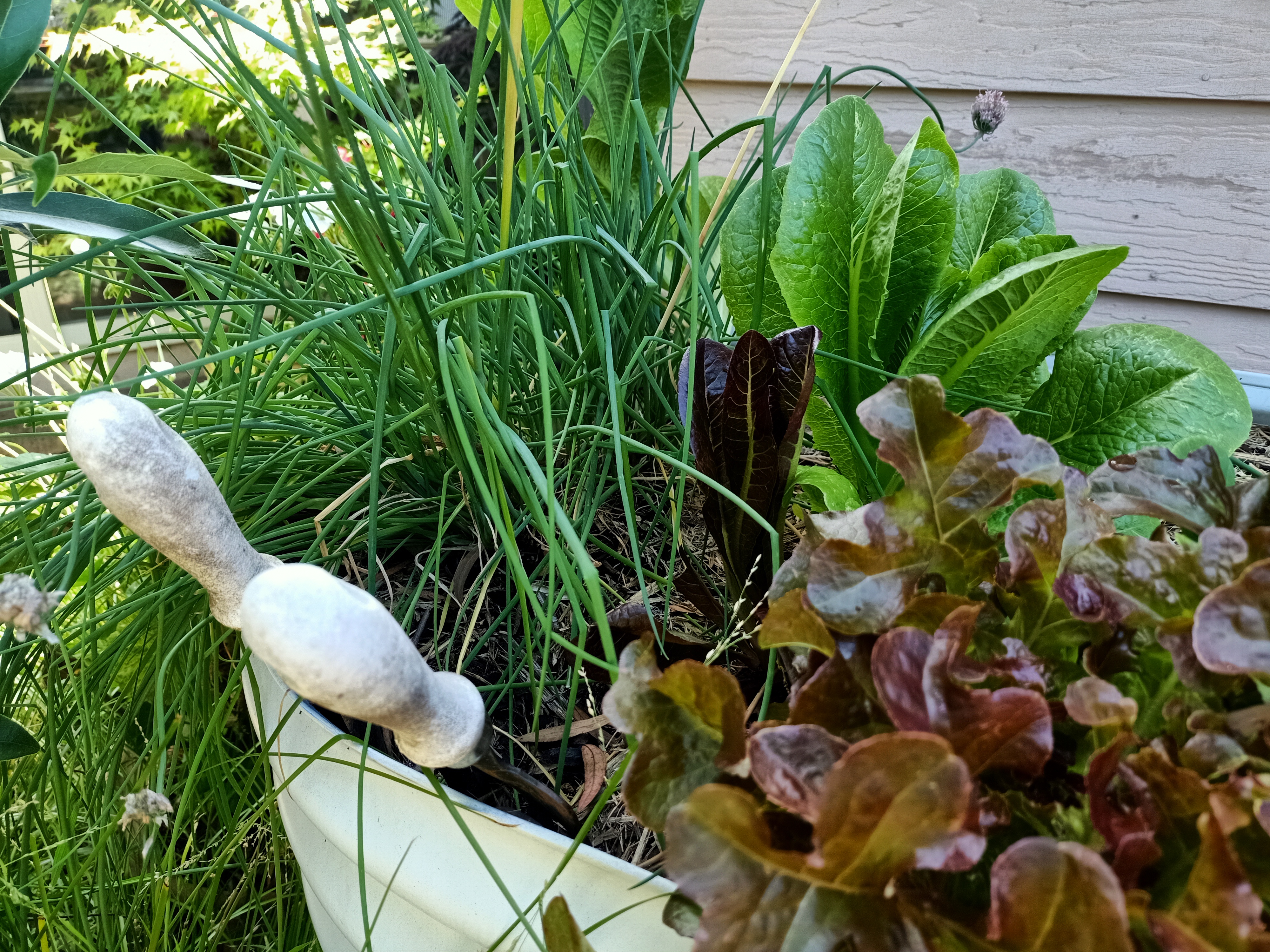 From June to August, there was plenty of frost, but not much produce. Only the lettuce, sheltering under the eaves, was unstoppable.