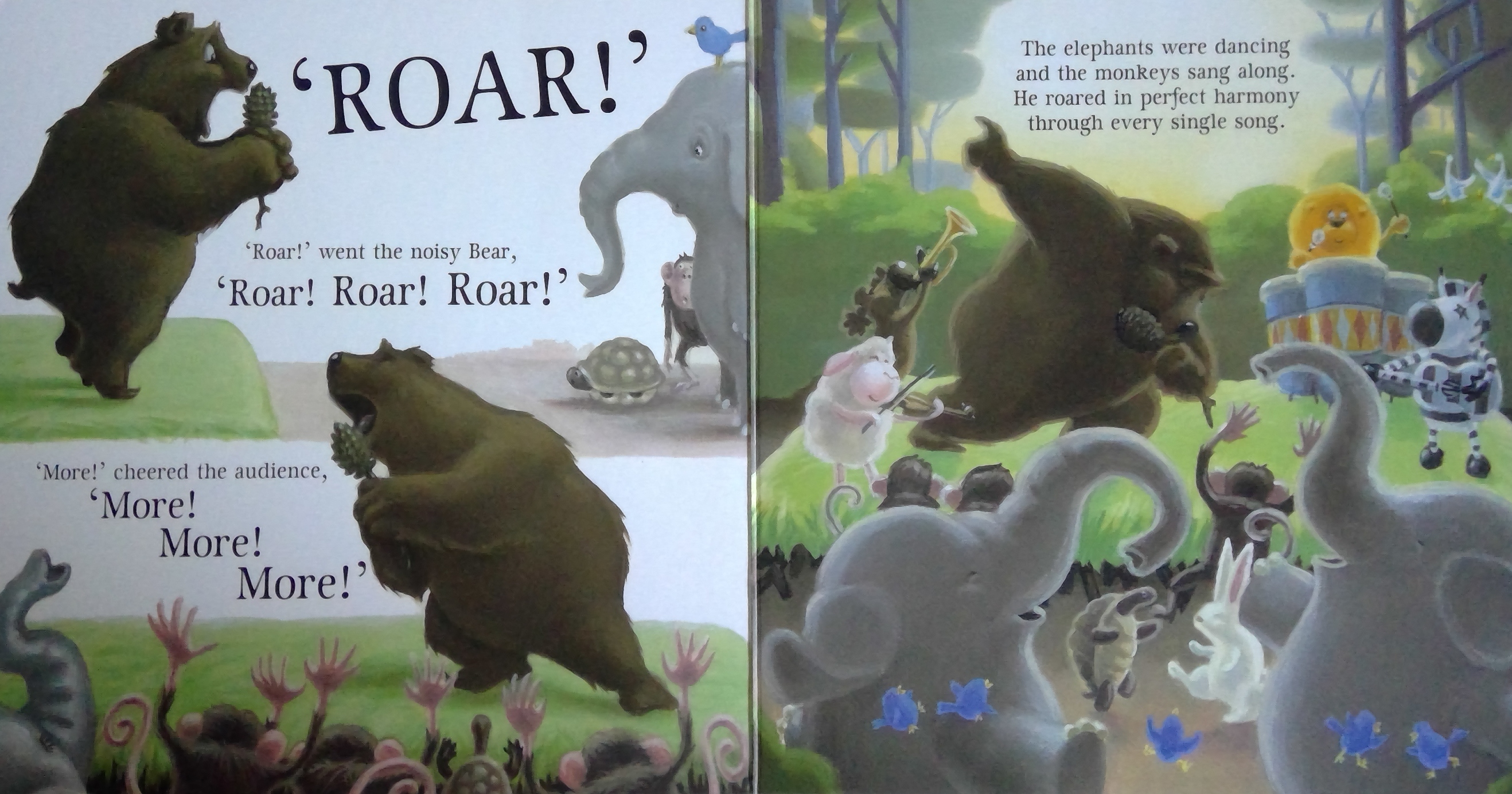 The Very Noisy Bear is a reminder that instruments can be played in different ways. Each one can produce sounds in a variety of tones (some pleasing; some … not so much). Reading Bland’s Bear book, you can make as many ‘unmusical’ sounds as you like. You’re limited only by your imagination.