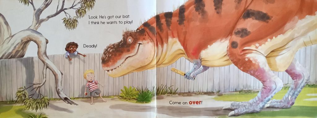 Over Is Out plays on a common backyard cricket rule: ‘over the fence is out’. In the Creaghs’ story, the ball sails into the neighbour’s yard and one young cricketer is sent to retrieve it. Unfortunately for him, the neighbours are dinosaurs. The book utilises the ‘there and back again’ narrative as the young batter scampers around the neighbour’s yard, seeking the ball among a variety of dinosaurs. He makes a quick exit as T-Rex stirs.