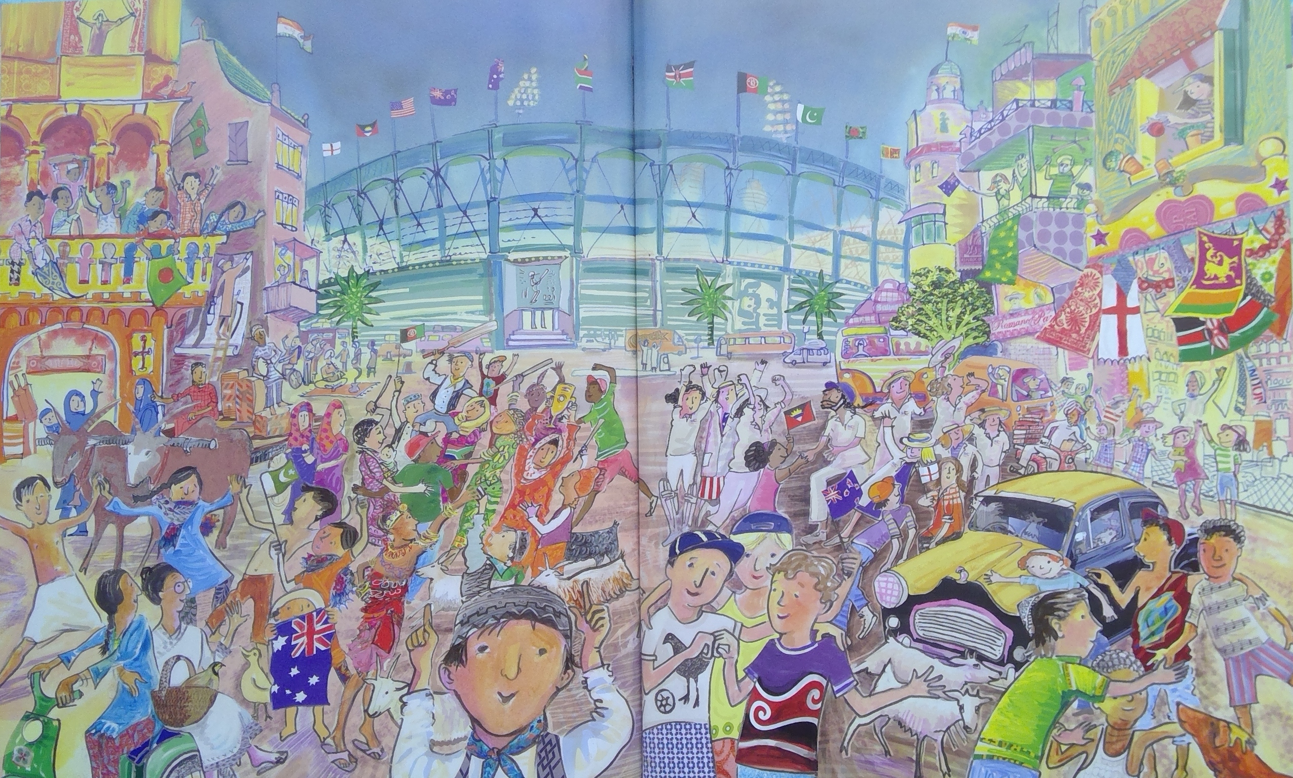 A rhyming story that skips around the globe. The opening and closing endpapers show maps of the story’s route through twelve countries, and double-page illustrations throughout the book provide plenty of country-specific context. The Australian scene (I think at Bondi Beach) includes a ubiquitous ute, surf lifesaving flags and a streaker. The final illustration is a joyous melange of cricketing fans and players from across the world.