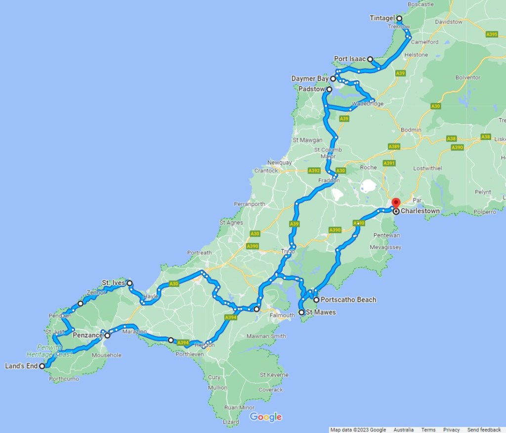 Here is a snapshot of some of my stopping-off points, listed in an anti-clockwise direction from Tintagel on the north coast, through Land’s End in the south-west and on to Charlestown in the south-east.