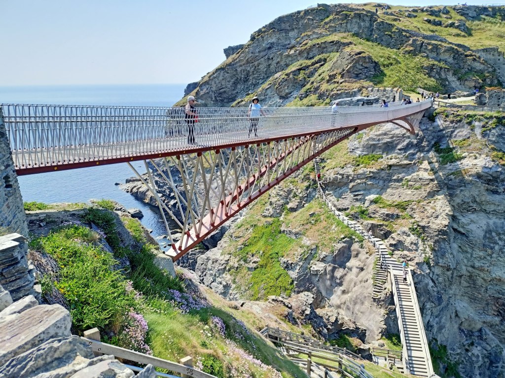 The castle at Tintagel is an English Heritage site. Access is via a path with 140 steps or the sturdy cantilever bridge (completed in 2019).