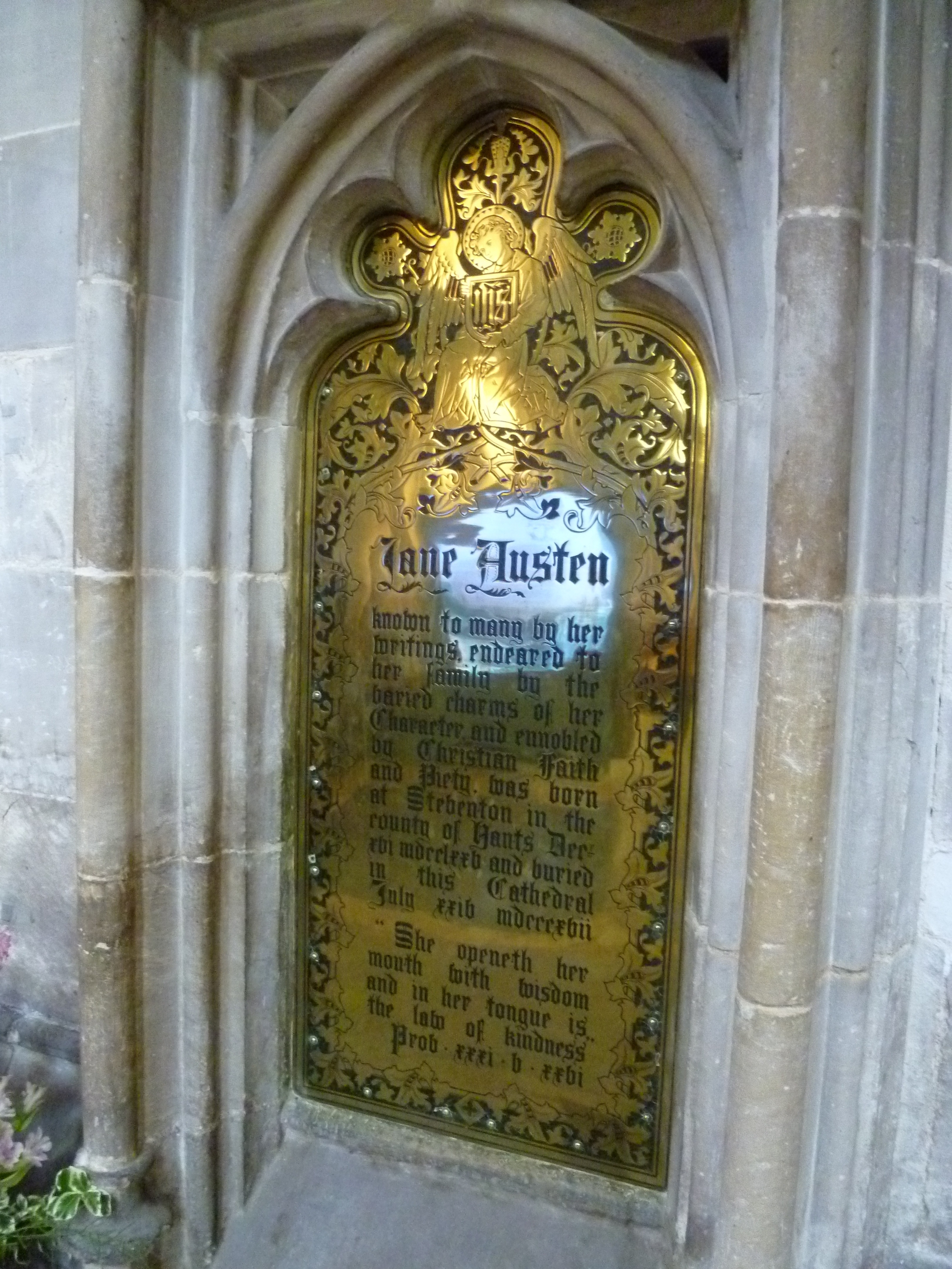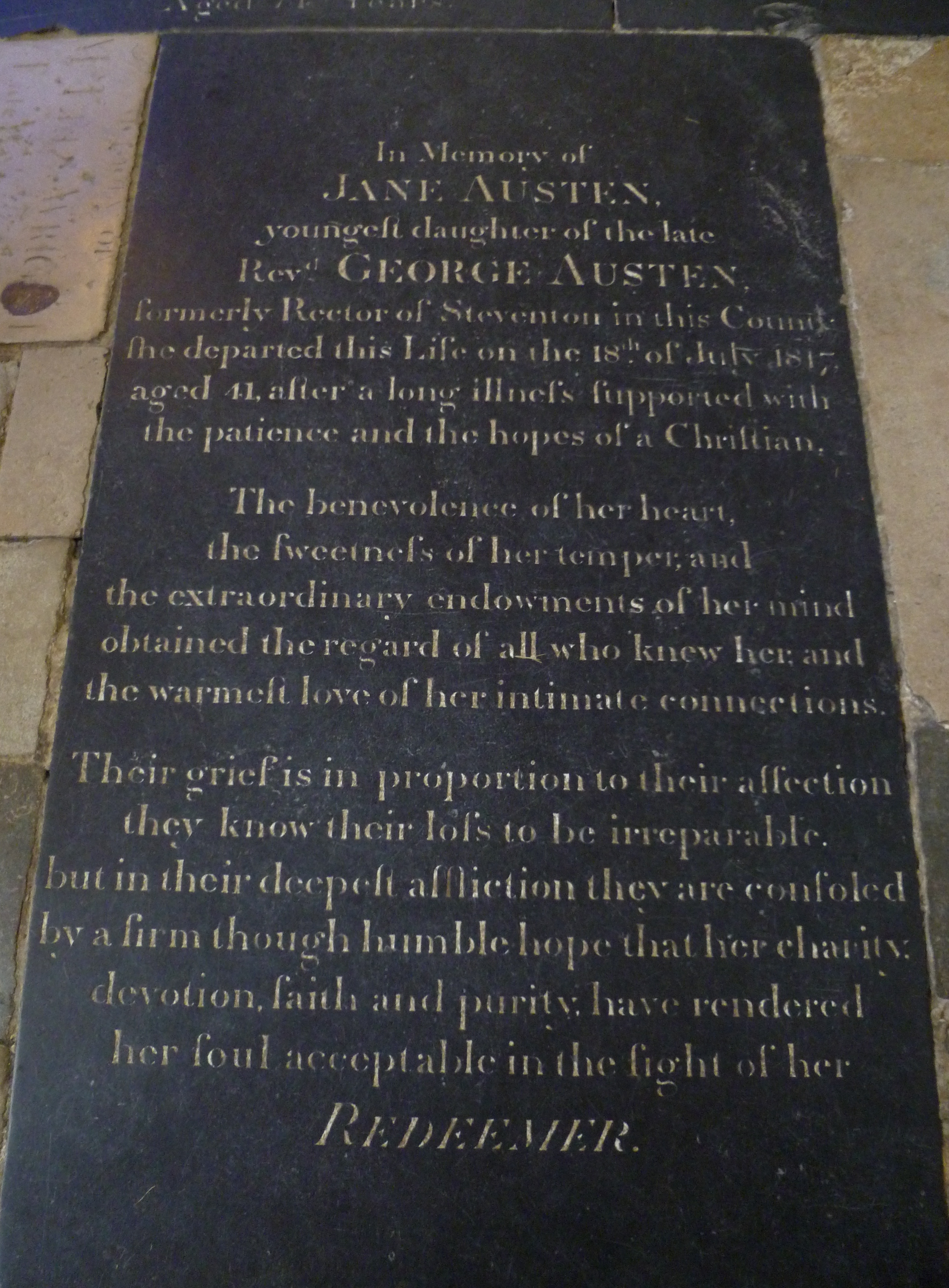 Austen’s memorial stone, placed above her grave in the north aisle reads, in part: ‘The benevolence of her heart, the sweetness of her temper, and the extraordinary endowments of her mind obtained the regard of all who knew her, and the warmest love of her intimate connections.