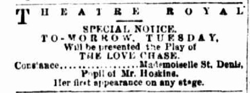 - Review of Marie St Denis’ performance in The Love Chase, The Ballarat Star, 23 November 1866, p.2