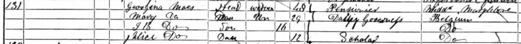 Eventually, a gravestone at the second site would bear an inscription naming Alice’s mother Georgina (d. 16 January 1871), her sister Marie (d. 19 March 1863) and two of Jean Baptiste Maes’s (Alice’s brother’s) children – eight-year-old Laura (d. 18 June 1890) and the infant Edgar (d. 9 January 1887).