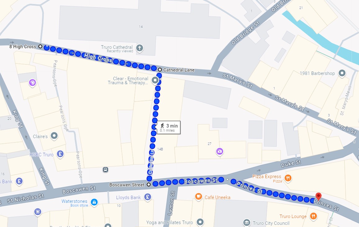 - Walking route, Assembly Rooms to Cardew (Warleggan townhouse), in Miller’s Dance, image courtesy of Google Maps