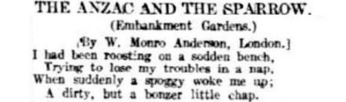 - ‘The ANZAC and the Sparrow: Embankment Gardens’, William Monro Anderson, The Register, 12 May 1917, p.4