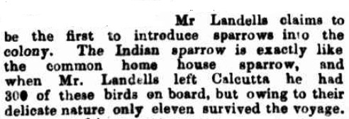 Most sources date the arrival of the first house sparrows to January 1863 but there is reliable evidence (‘Inaccuracies in the History of a Well-Known Introduction’) that the first cargo arrived some weeks earlier, in late November 1862. Several Melbourne newspapers reported on a trip to India undertaken by Mr G J Landells. Landells had lived variously in the West Indies, England and India before arriving in Australia in 1856. (He gained some notoriety as the importer and manager of camels for the fateful Burke and Wills expedition in 1860-1861.)